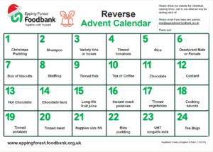 Take part in our Reverse Advent Calendar by adding one festive item or essential each day — things like tinned tomatoes, custard, hot chocolate, Christmas pudding, toiletries and more.